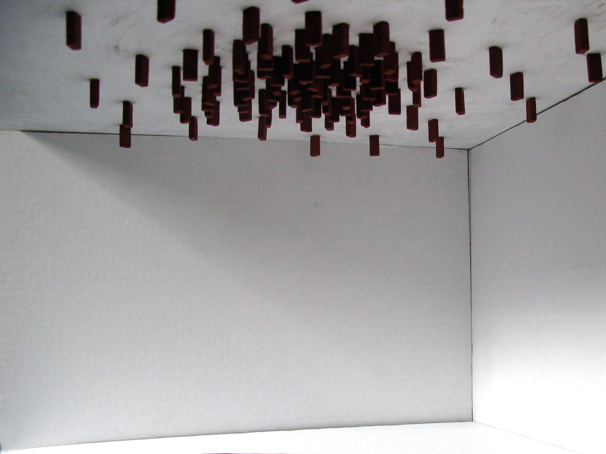 The semi-industrial installation plays with the concept of displacement and illusion. The viewer, entering an empty space and looking up, discovers an upside-down world on the ceiling made from bricks reminding of a city-scape.