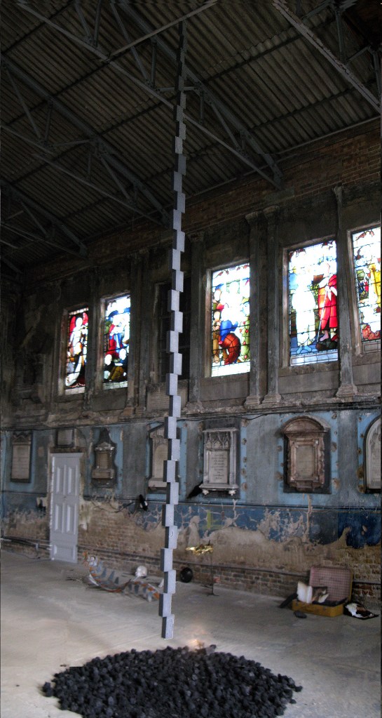 The work connects to this site by utilizing one of the features of the chapel – its height, this in itself is a challenge. Philosphicaly reflectcted, the Asylum church gives room for thoughts of the heavenly Asylum and how to attain it. Its dilapidated state however shows that such thoughts are just dreams. Like the Asylum chapel doesn’t give shelter for refugees, so there is no escape or refuge from the Universal Evil.