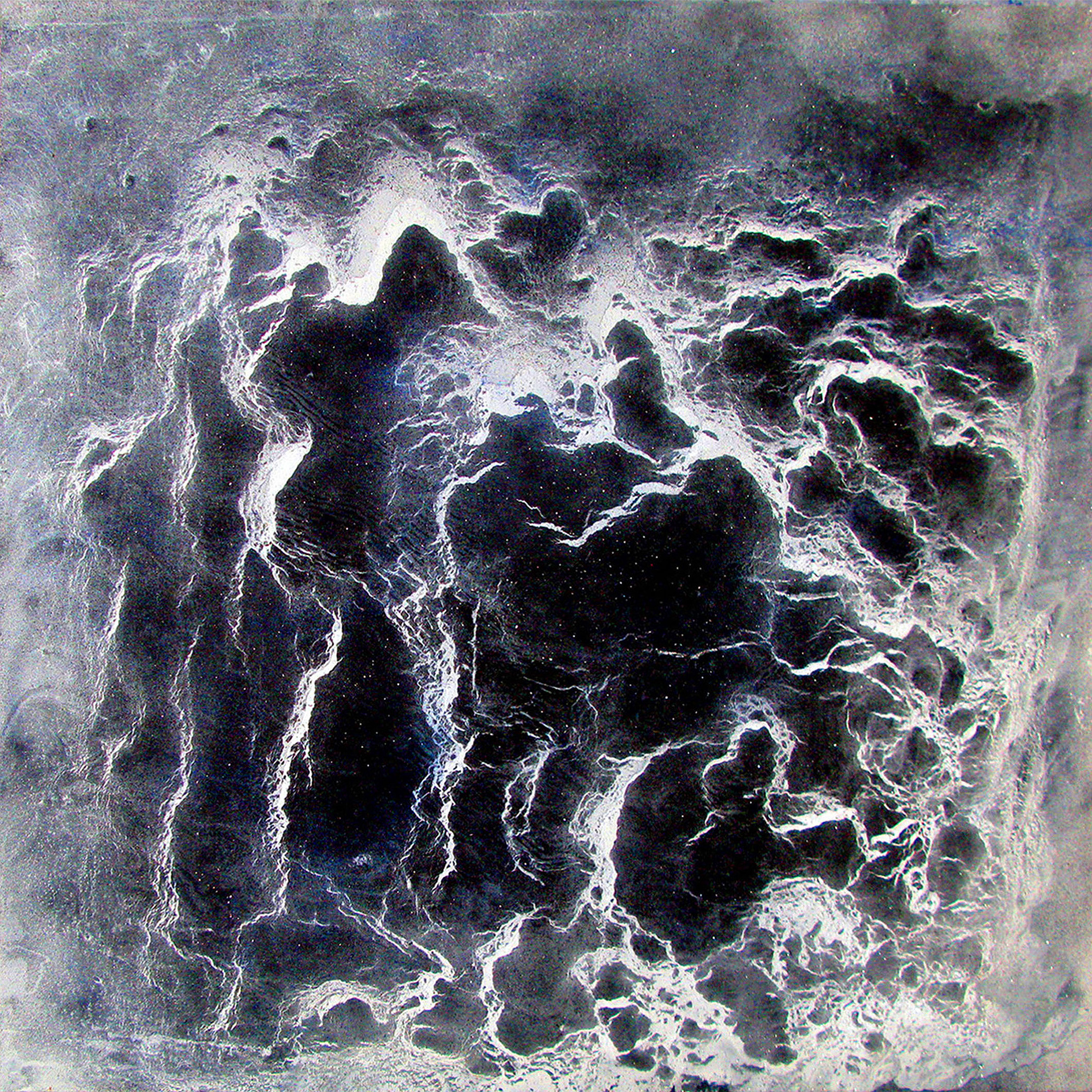 Acrylic, sand, volcanic ash, glass & mirror splinters, spray on canvas, 200 x 200 x 6 cm