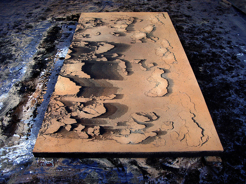 Acrylic, sand, volcanic ash, iron pigments, glass, spray on canvas, 200 x 200 x 6 cm